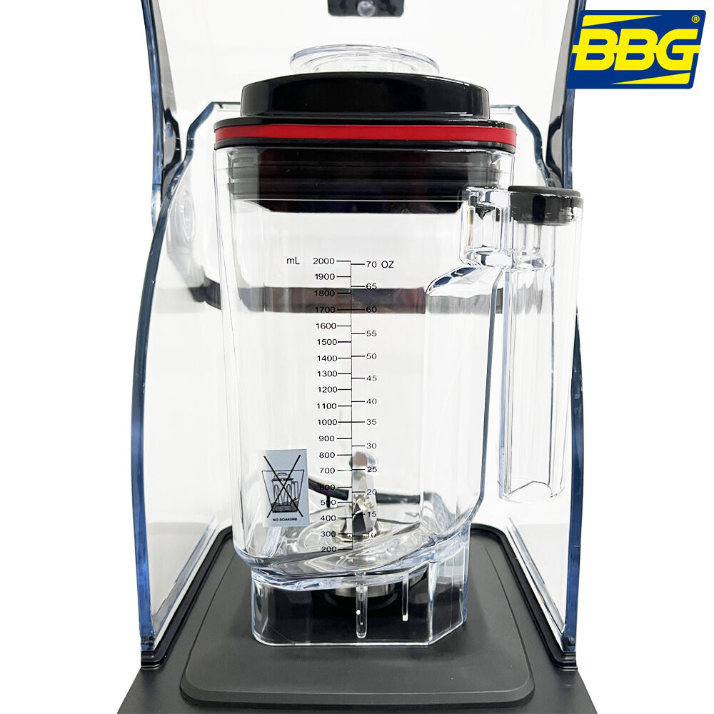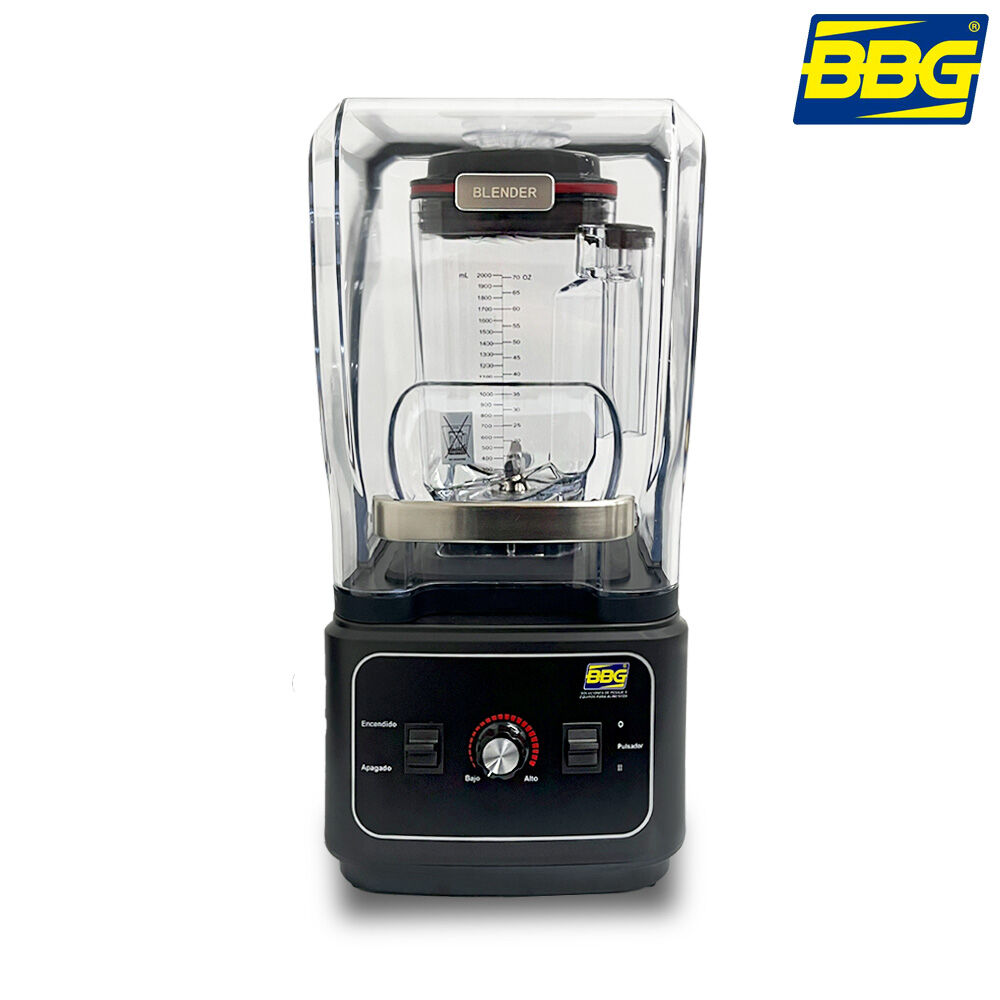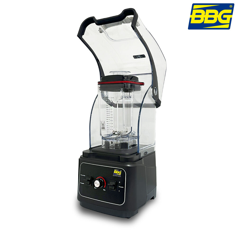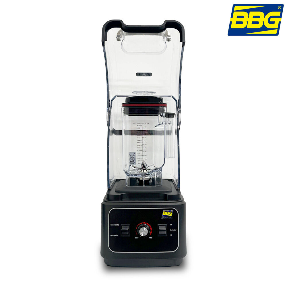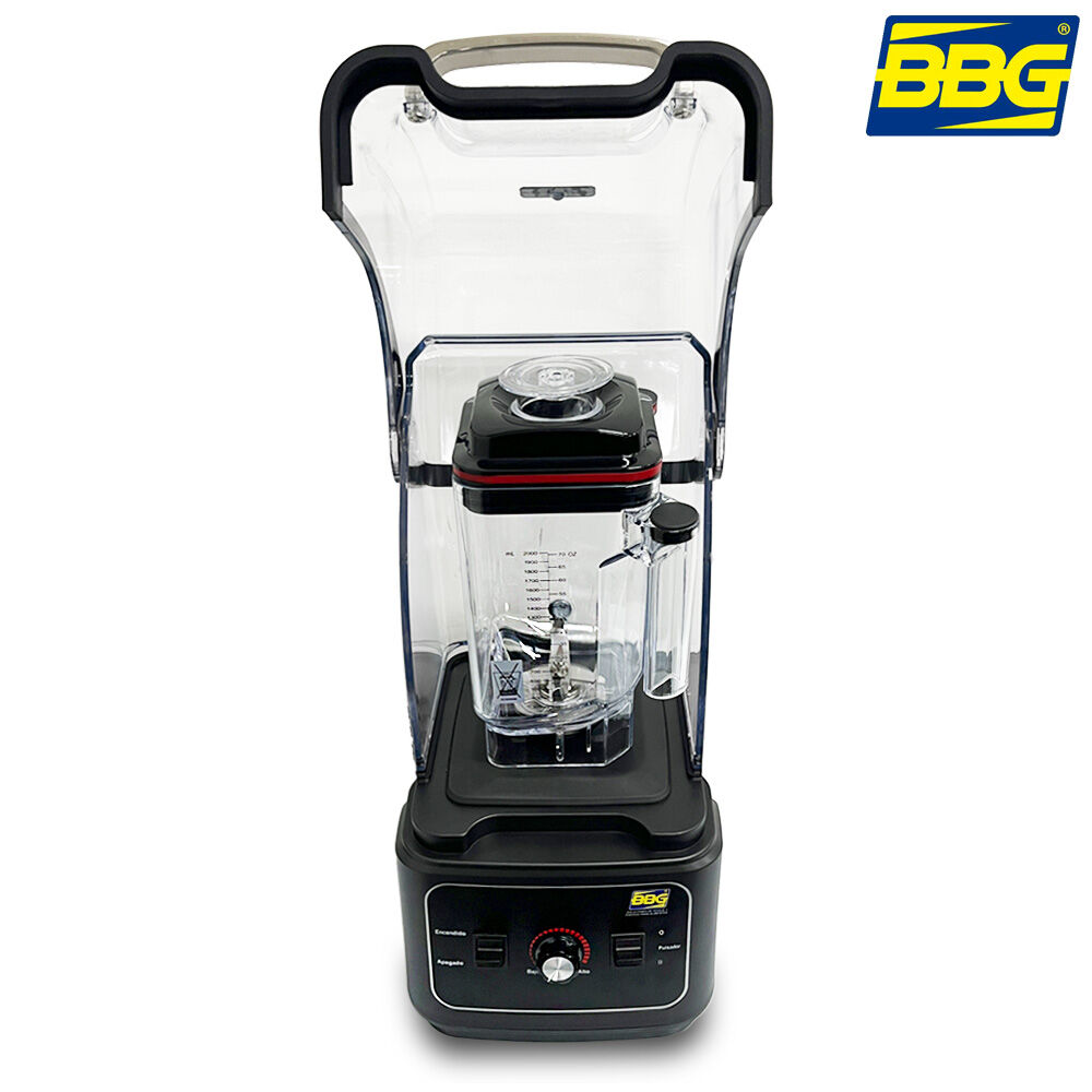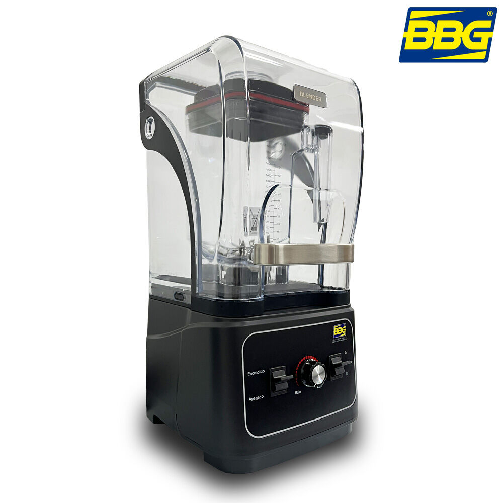 - Licuadora de uso comercial BBG con cabina anti-ruido, diseñada para trabajo continuo en bares, restaurantes y cafeterías.